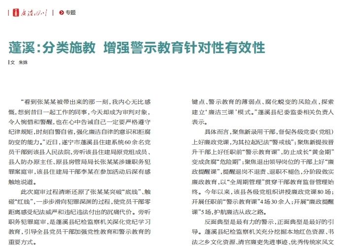 “我们根据近年来查处的干部违纪违法案例分析,坚持分层分类开展警示教育,紧盯干部入职成长的关键点、警示教育的薄弱点、腐化蜕变的风险点,探索建立‘廉洁三课’模式。”蓬溪县纪委监委相关负责人表示。