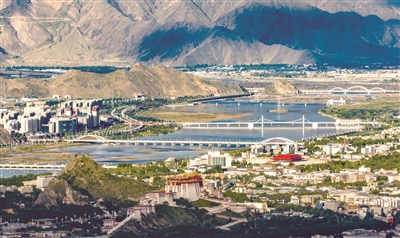 这是近日拍摄的拉萨河风光。由近及远分别是连心桥、柳梧大桥、和美桥和青藏铁路拉萨河特大桥。新华社记者 姜帆 摄