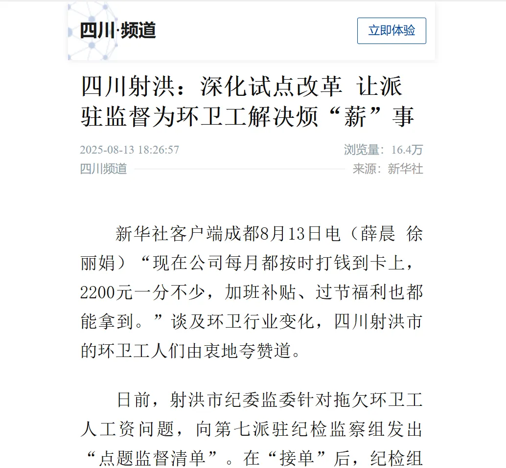 《四川射洪:深化试点改革 让派驻监督为环卫工解决烦“薪”事》