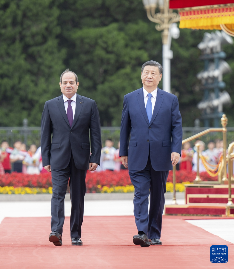 5月29日下午,国家主席习近平在北京人民大会堂同来华出席中国-阿拉伯国家合作论坛第十届部长级会议开幕式并进行国事访问的埃及总统塞西举行会谈。这是会谈前,习近平在人民大会堂东门外广场为塞西举行欢迎仪式。新华社记者 翟健岚 摄