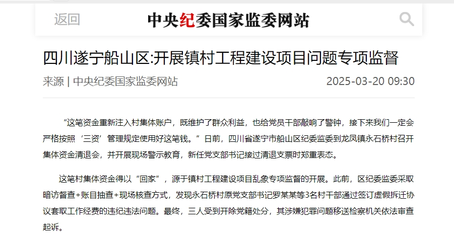 《四川遂宁船山区:开展镇村工程建设项目问题专项监督》